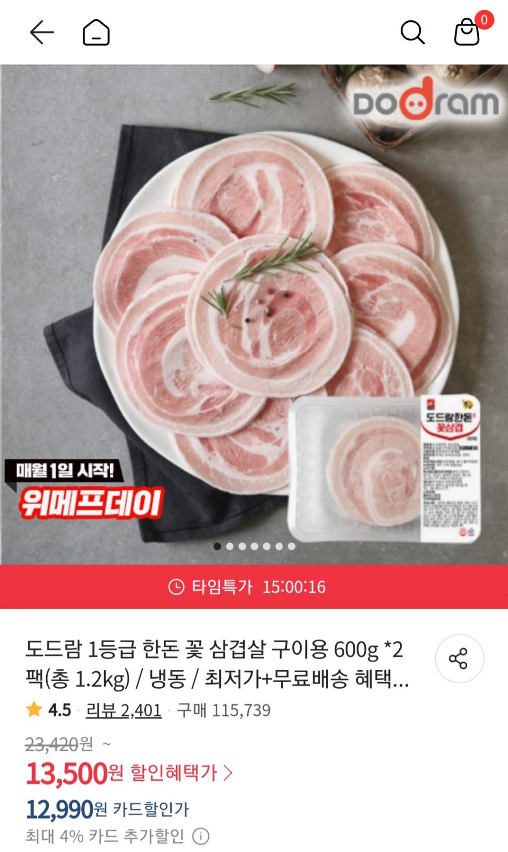 [위메프] 1등급 한돈 도드람 꽃삼겹살 1.2kg 구이용 (냉동)