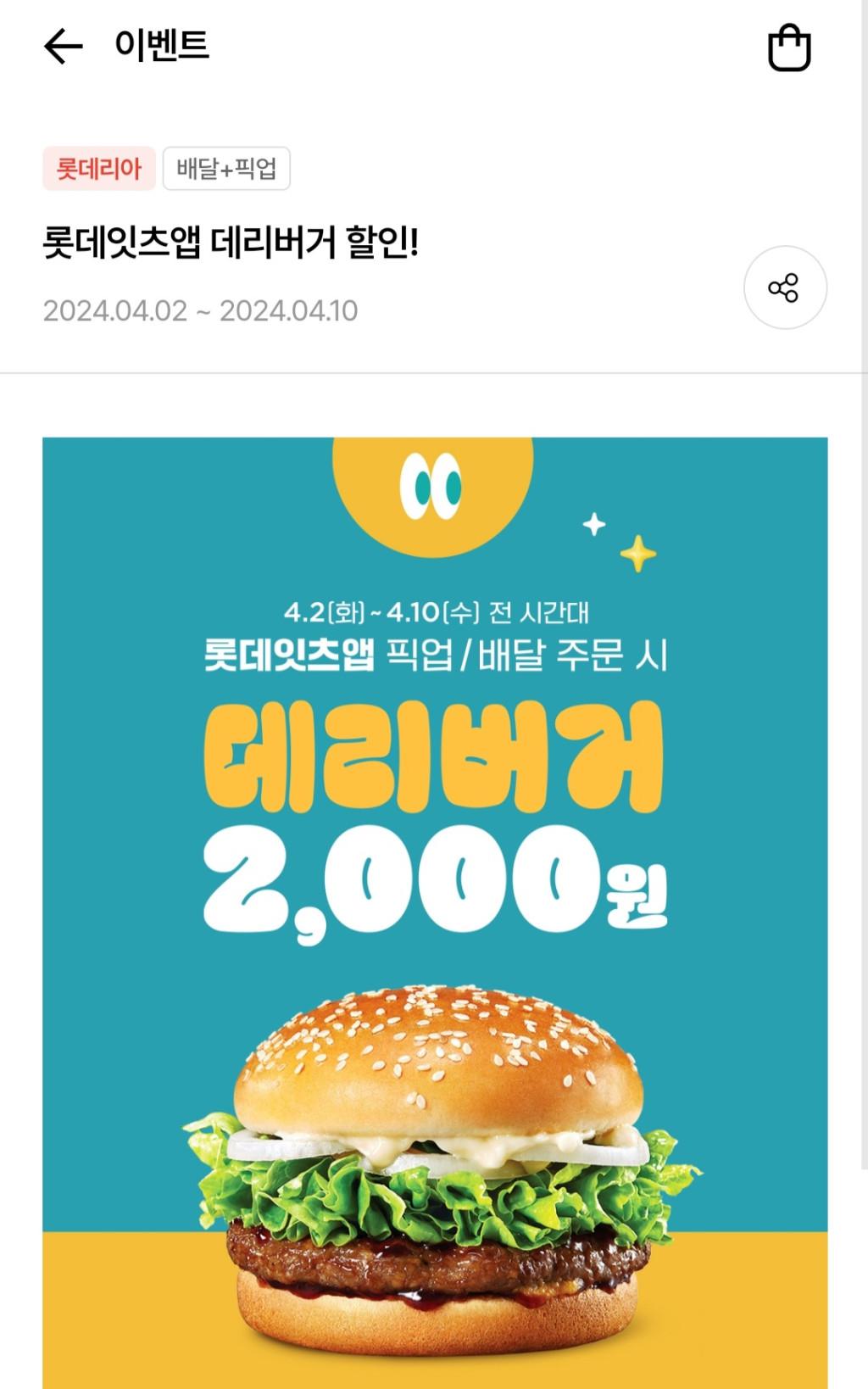 [기타] 롯데잇츠앱 데리버거 단품 배달,픽업 전용