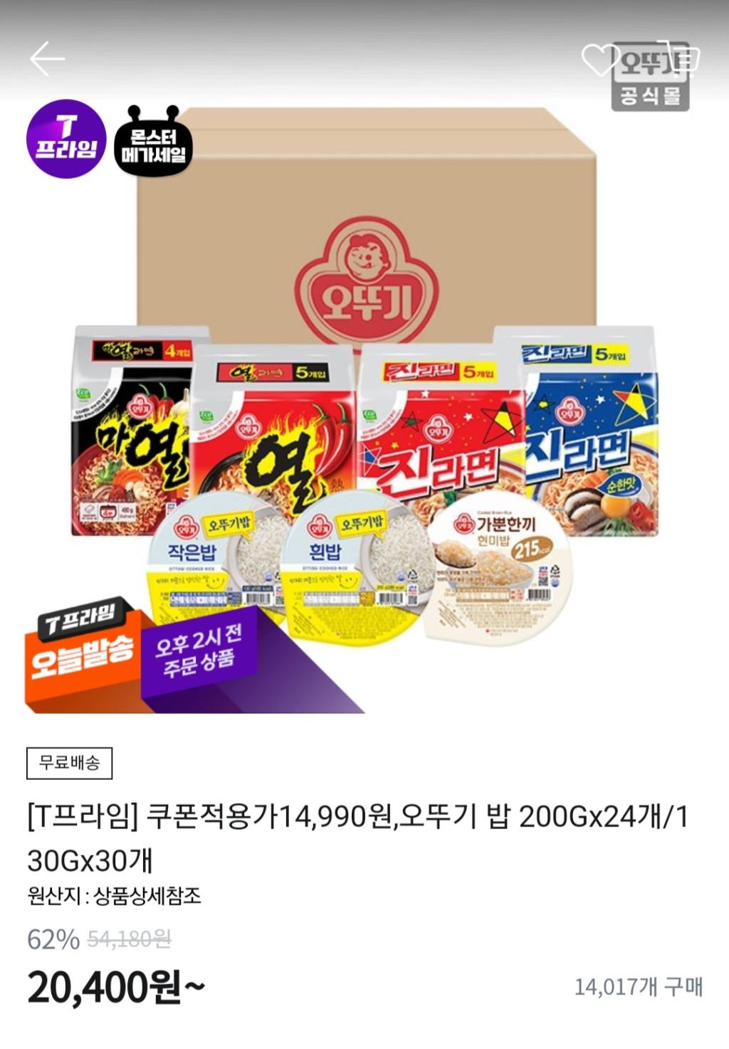 [티몬] 진라면 순한맛 / 매운맛 40봉 한박스 15,021원 (무료배송)