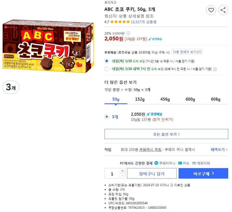 [쿠팡] 롯데제과 ABC초콜릿 초코쿠키, 50g, 32개