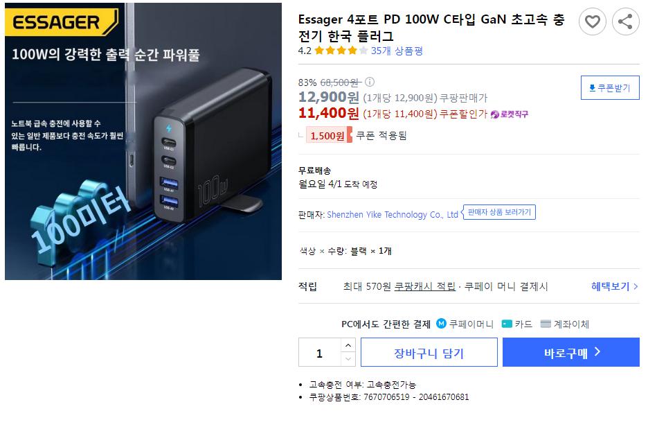 [쿠팡] Essager 4포트 PD 100W C타입 GaN 초고속 충전기 한국 플러그