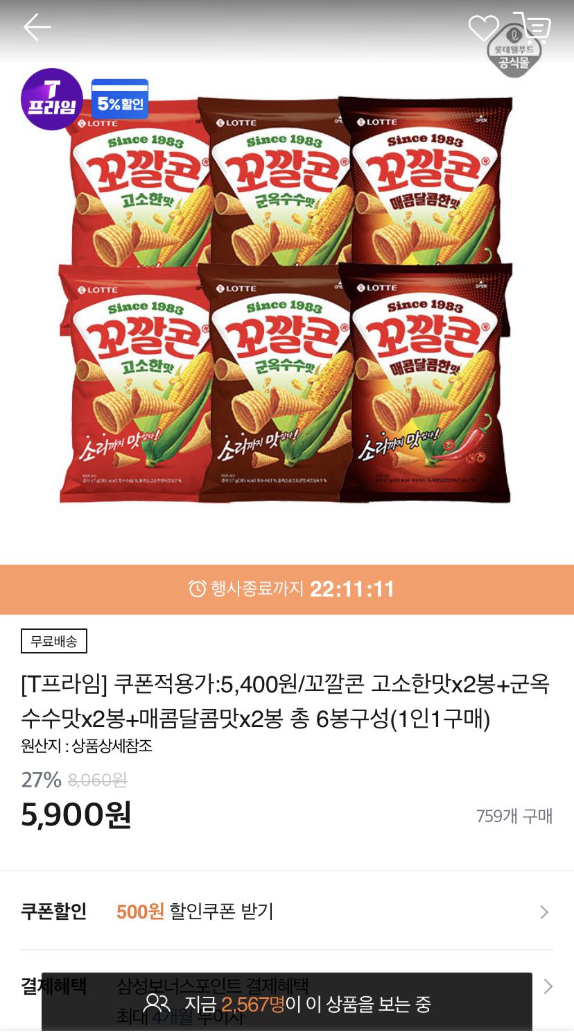 [티몬] 꼬깔콘 고소한맛x2봉+군옥수수맛x2봉+매콤달콤맛x2봉