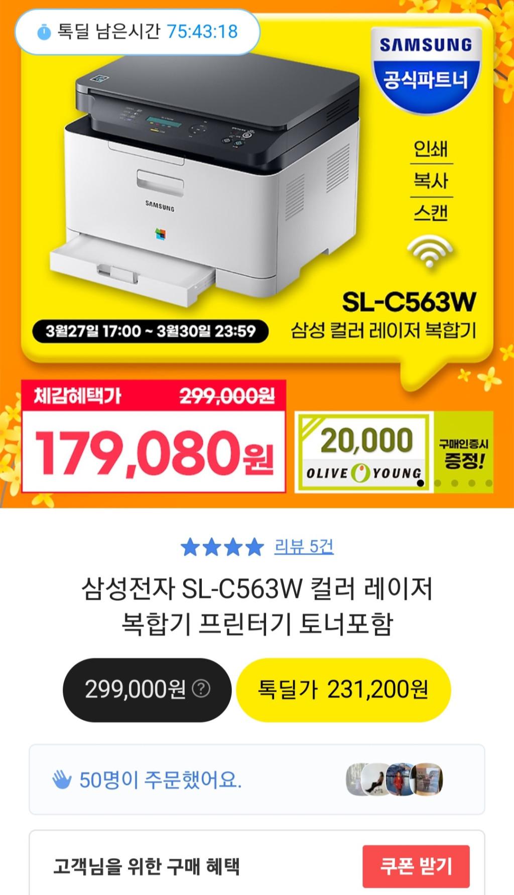 [카카오톡딜] 삼성전자 SL-C563W 컬러 레이저 복합기 프린터기 토너포함 (무배)