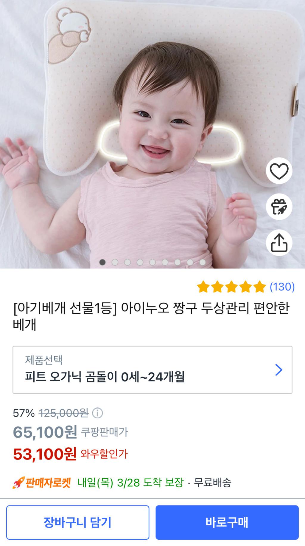 [쿠팡] 아이누오 두상관리 아기베개 (53,100원/무배)