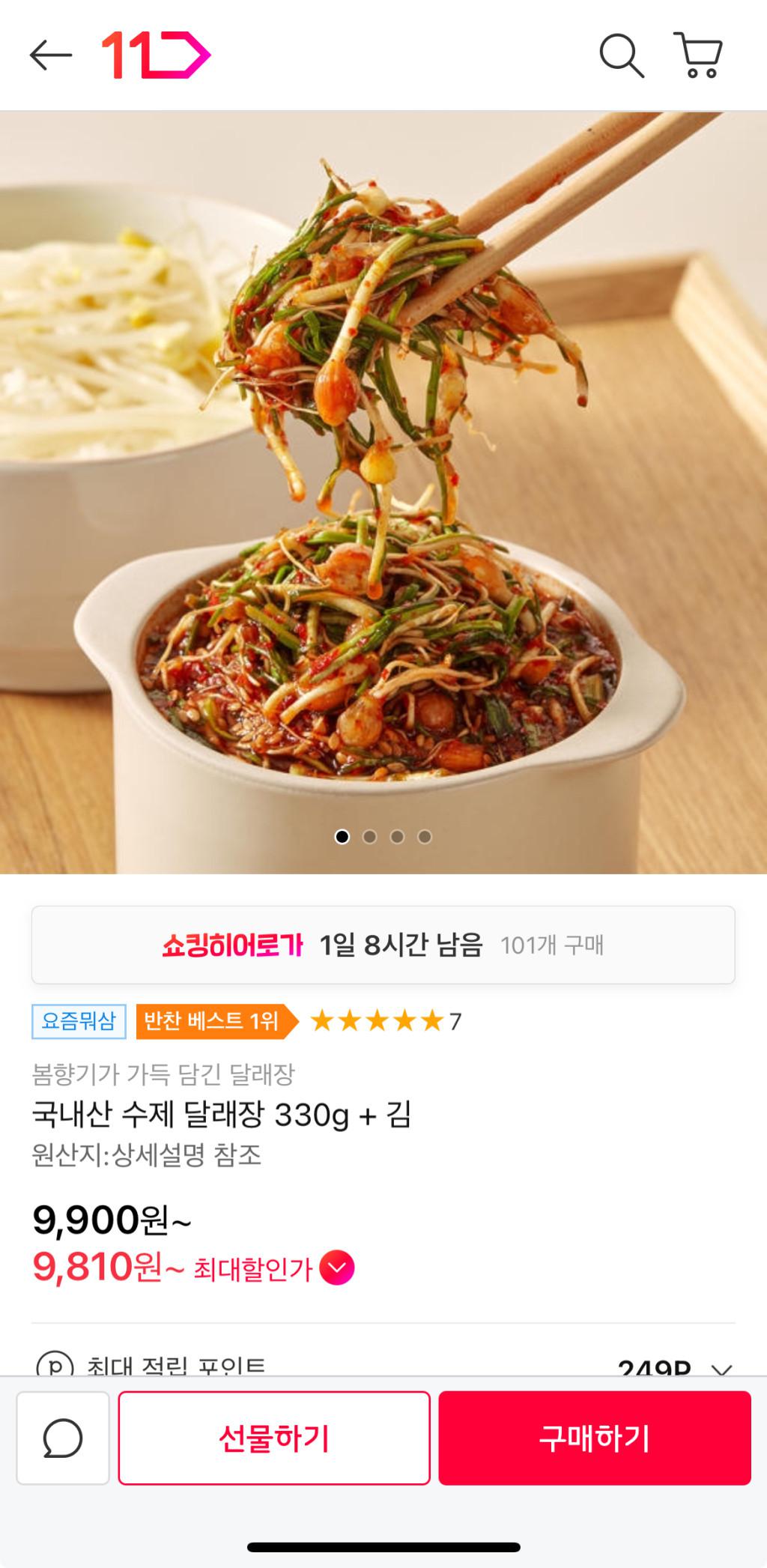 [11번가] 국내산 수제 달래장 330g (9,900원/무배)