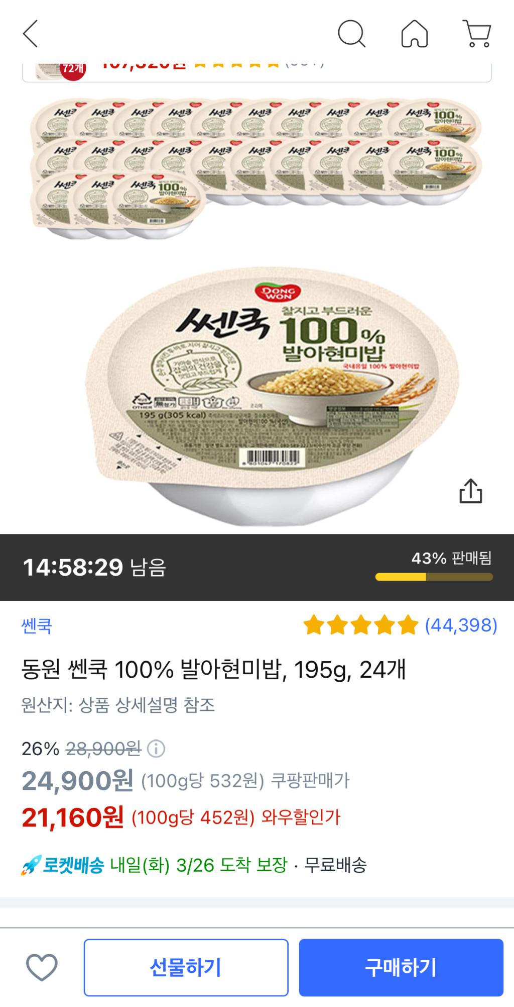 [쿠팡] 동원 쎈쿡 100% 발아현미밥 195g x 24개