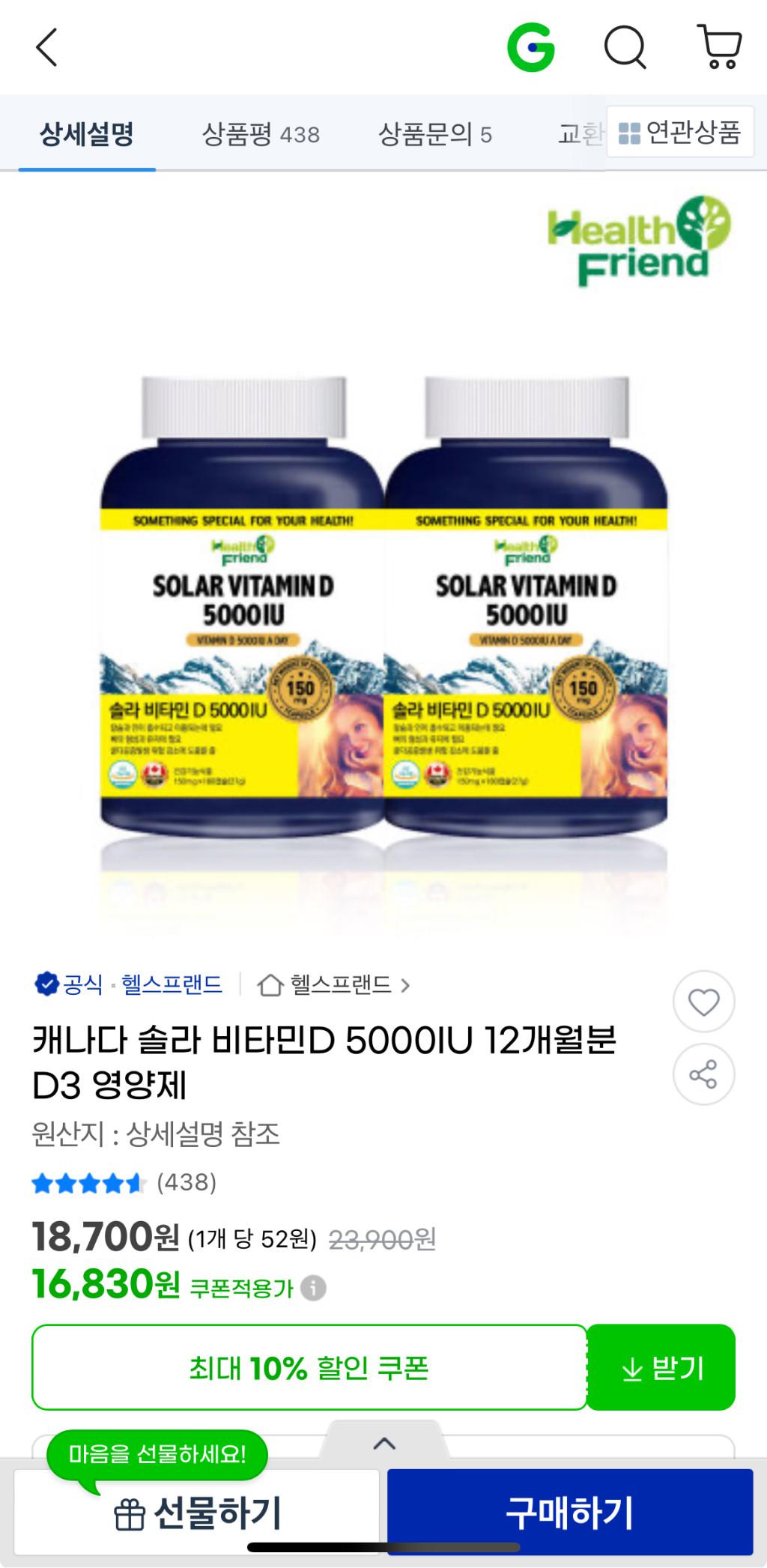 [G마켓] 캐나다 솔라 비타민D 5000IU 12개월분 (16,830원/무배)
