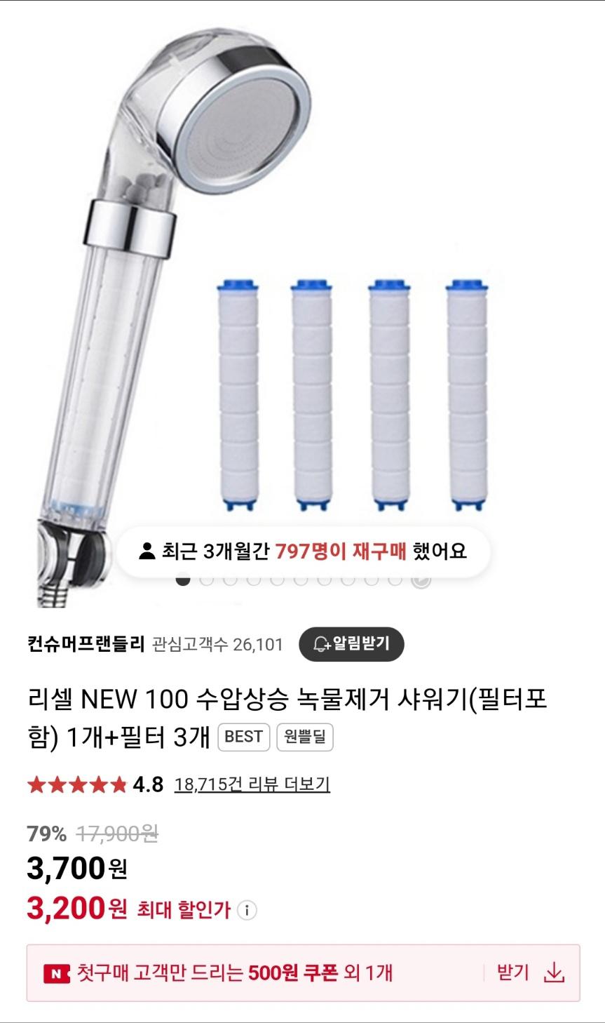 [네이버] 리셀 NEW 100 수압상승 녹물제거 샤워기(필터포함) 1개+필터 3개