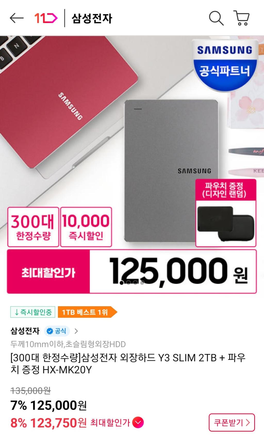[11번가] 삼성전자 외장하드 Y3 SLIM 2TB+파우치증정 HX-MK20Y