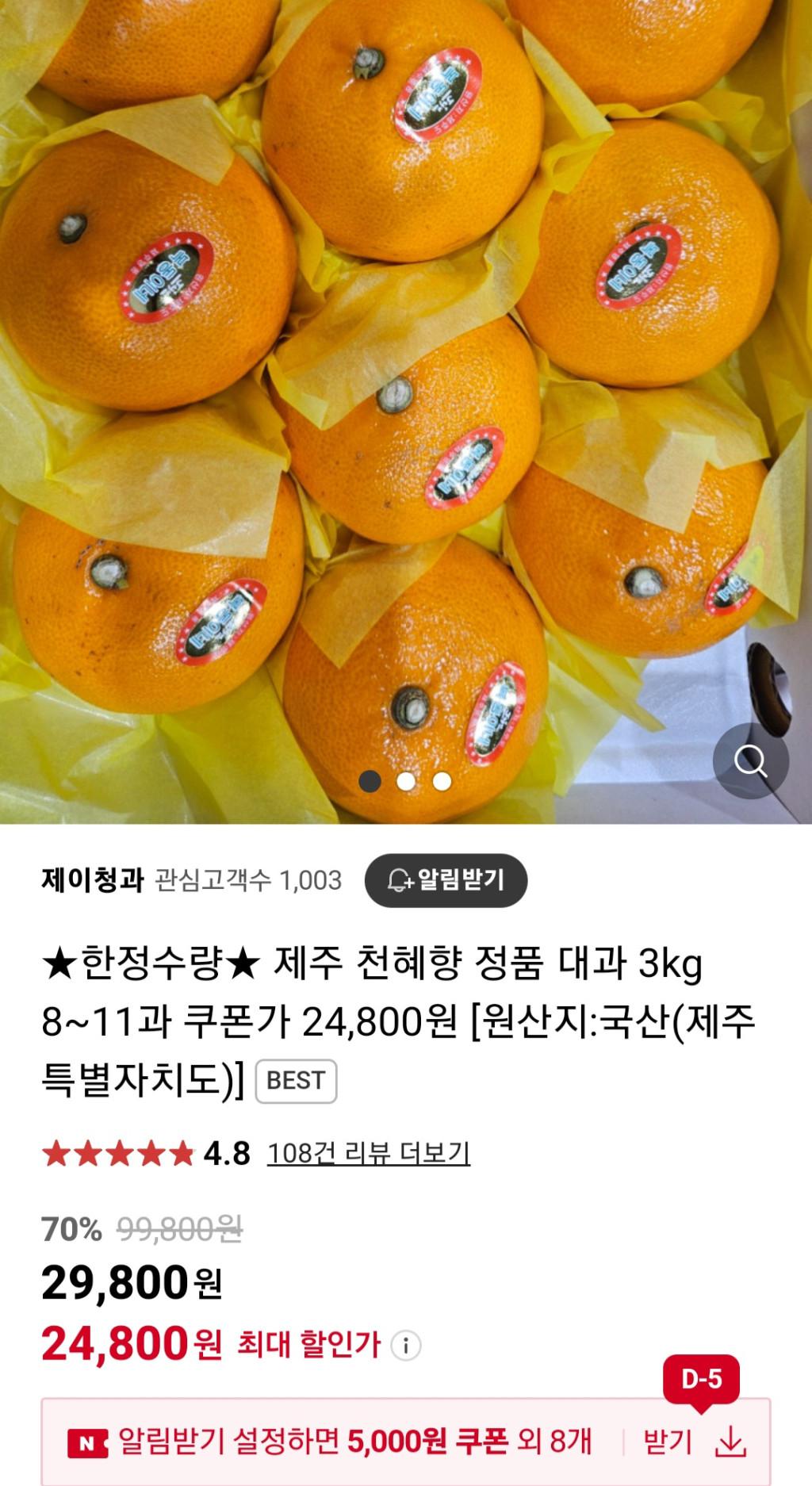 [네이버] 제주 천혜향 정품 대과3kg 24,800원 무배