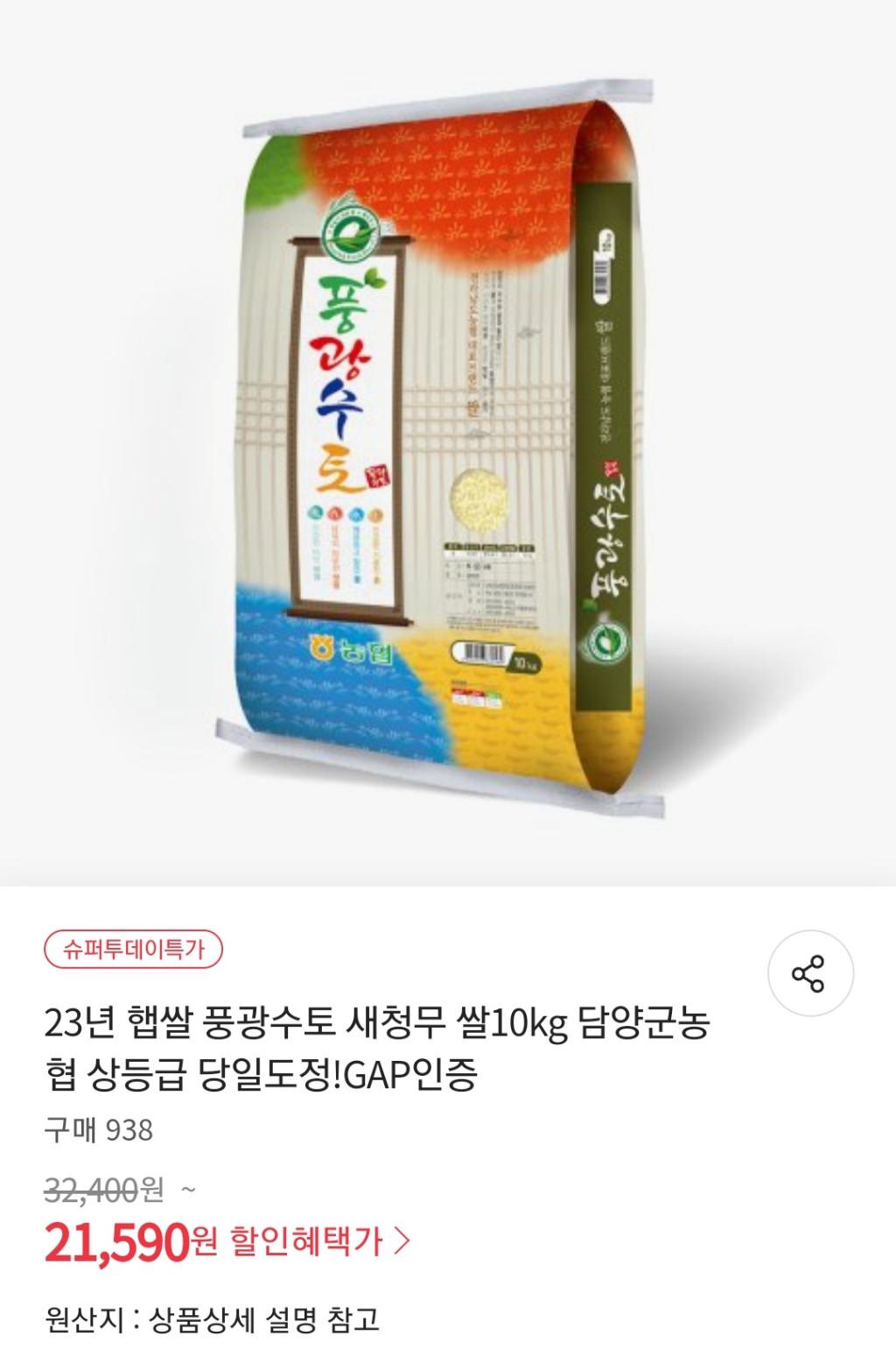 [위메프] 23년 햅쌀 풍광수토 새청무 쌀10kg 상등급 당일도정 GAP인증