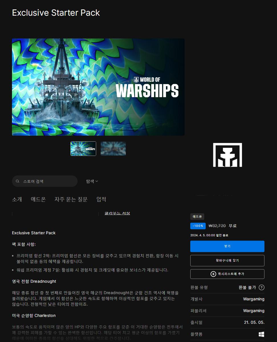 [기타] 에픽게임즈 World of Warships - Exclusive Starter Pack