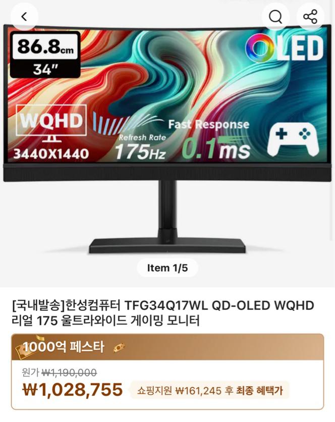 [알리] 한성컴퓨터 34인치 OLED 175Hz 모니터 TFG34Q17WL 출시특가