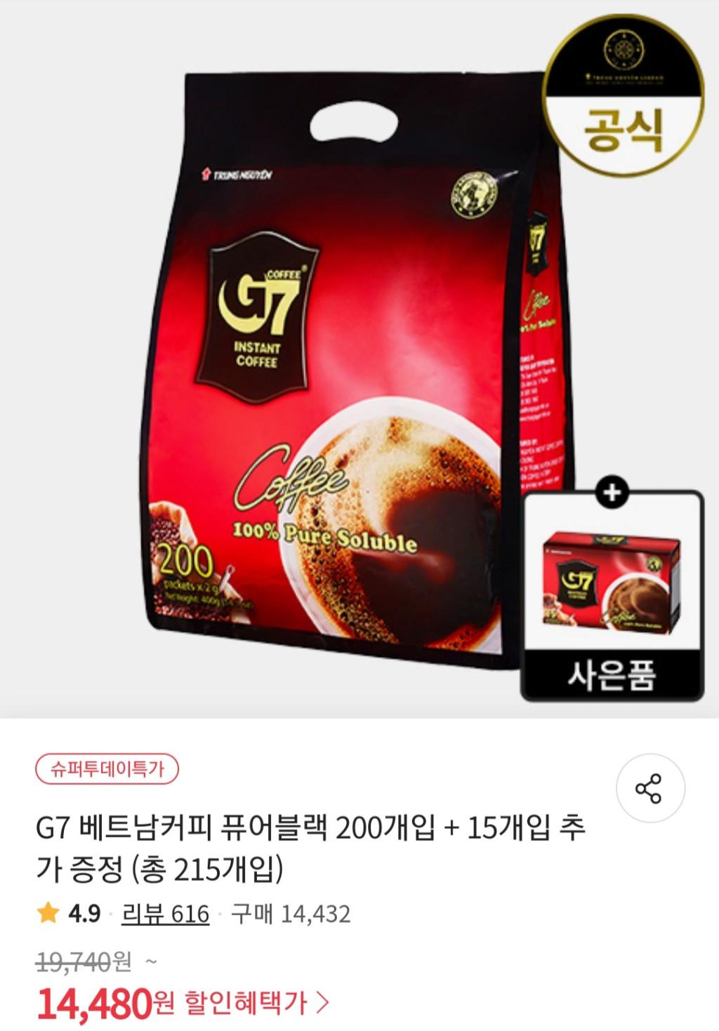 [위메프] G7 퓨어블랙 커피 200스틱 + 15스틱
