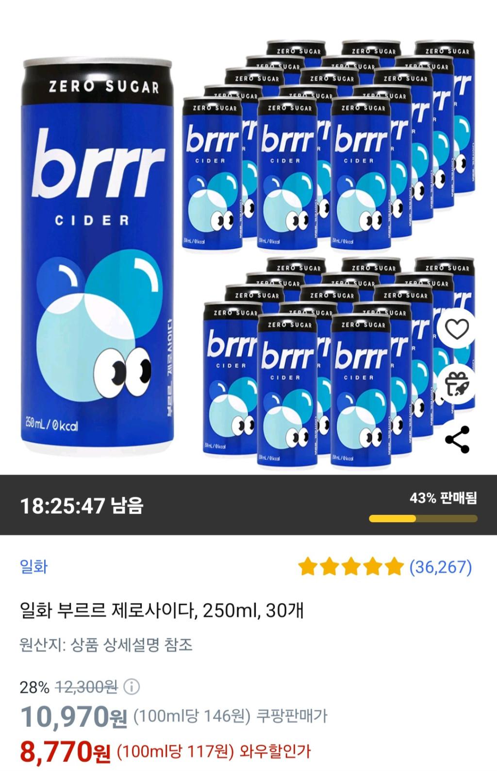 [쿠팡] 일화 부르르 제로사이다 250ml 30캔