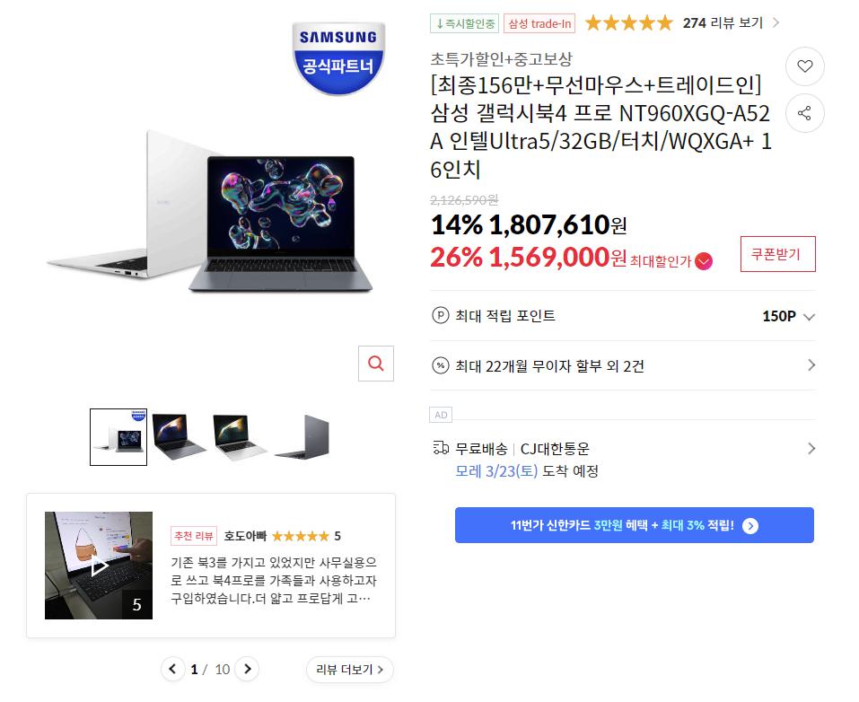 [11번가] 삼성 갤럭시북4 프로 NT960XGQ-A52A (1,569,000원/무료)