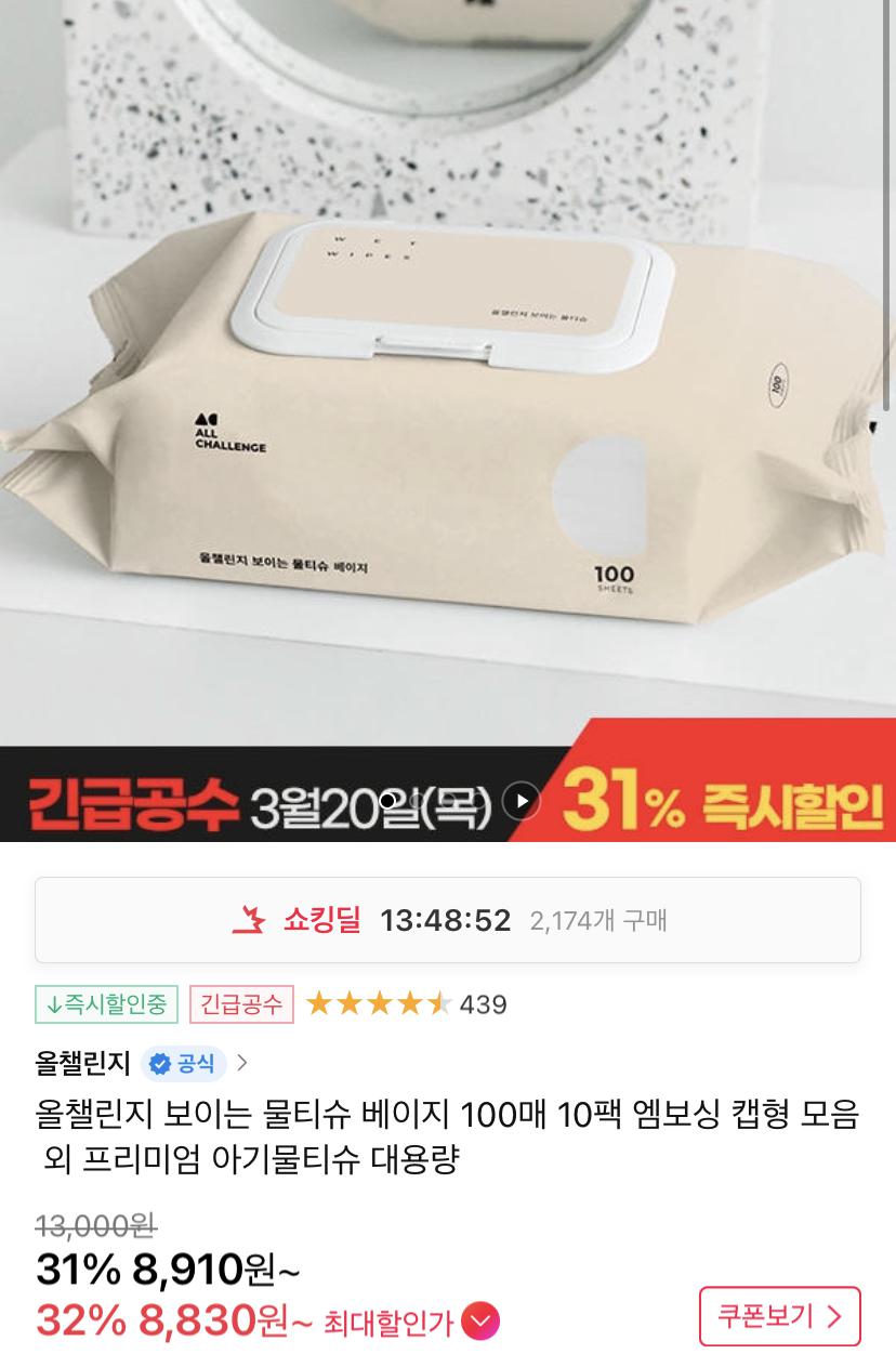 [11번가] 물티슈 베이지 100매 10팩 엠보싱 캡형