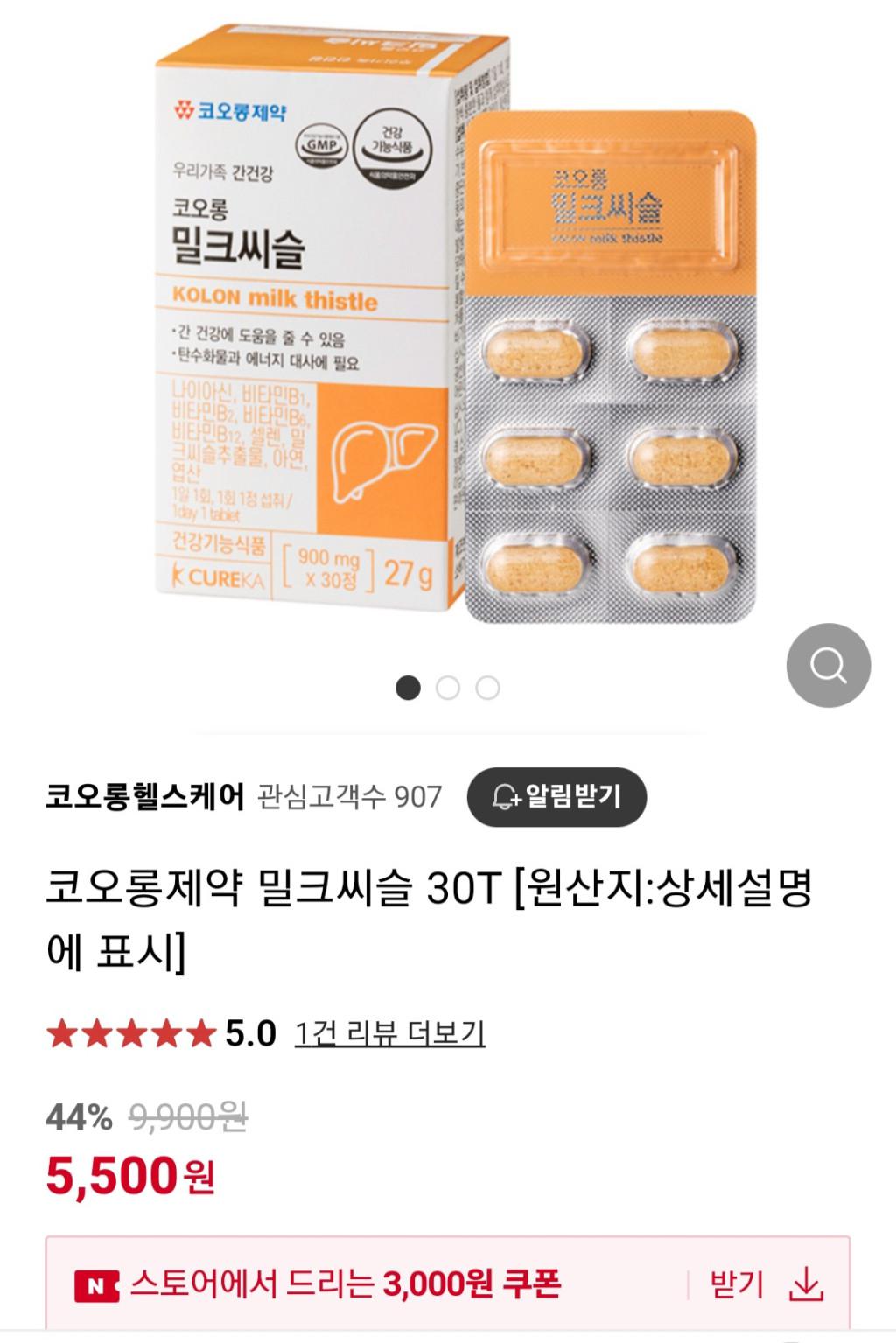 [네이버] 코오롱제약 밀크씨슬900mg 30개 5,500원 유배