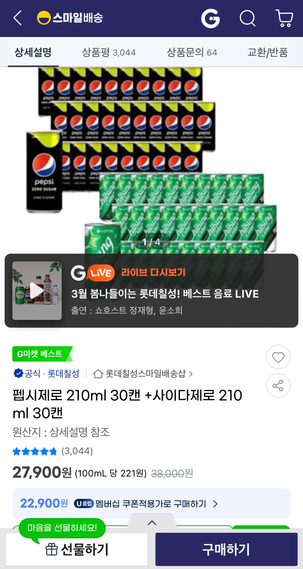 [G마켓] 펩시제로 210ml 30캔 +사이다제로 210ml 30캔