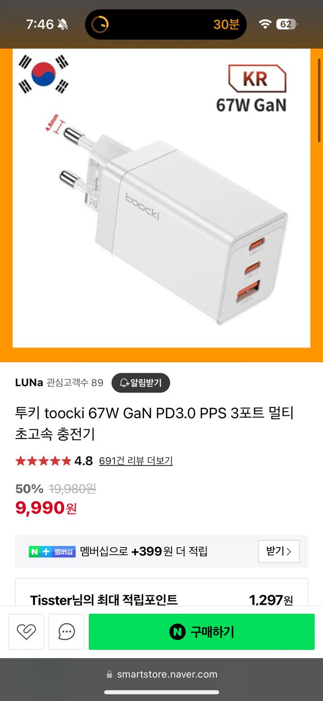 [네이버] [네이버] Toocki 67W GAN PD 3포트 초고속 충전기 (9,900원/무료배송…