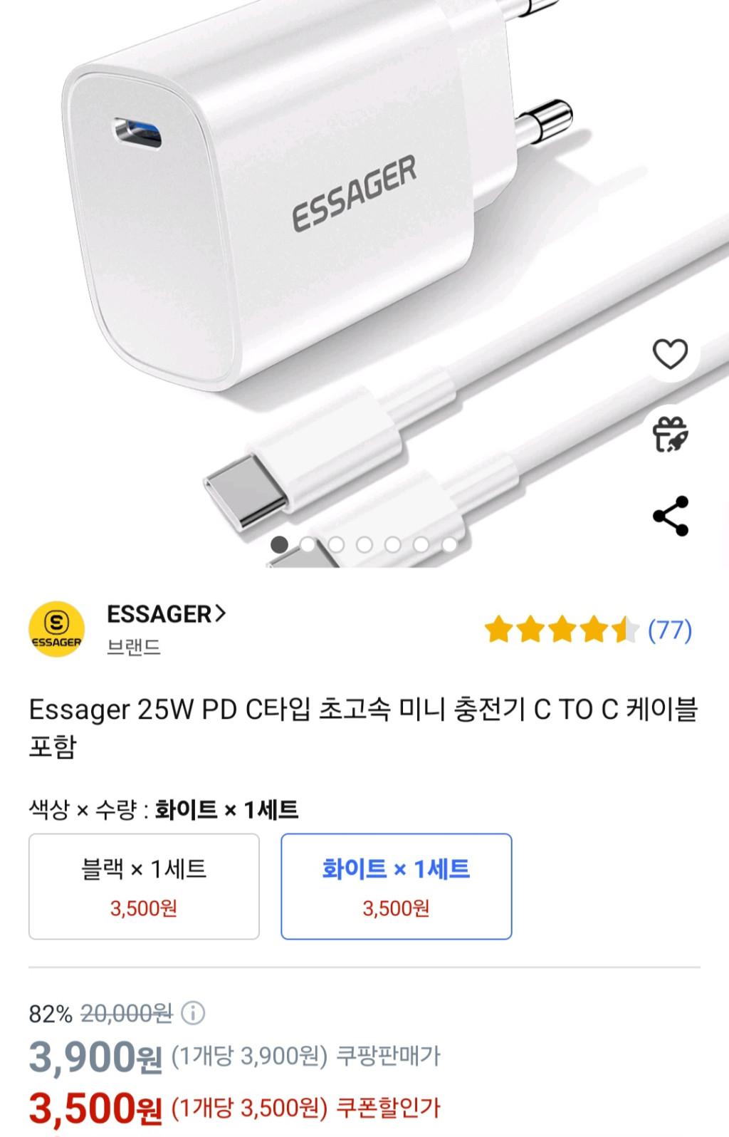 [쿠팡] Essager 25W PD C타입 초고속 미니 충전기 C TO C 케이블 포함
