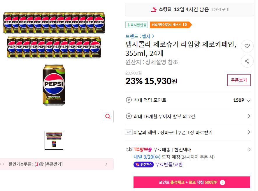 [11번가] 펩시콜라 제로슈거 라임향 제로카페인, 355ml, 24개