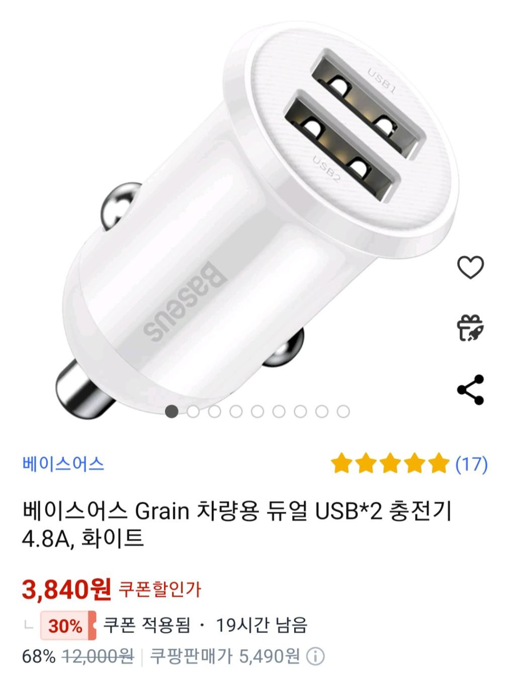 [쿠팡] 베이스어스 Grain 차량용 듀얼 USB*2 고속충전기 4.8A