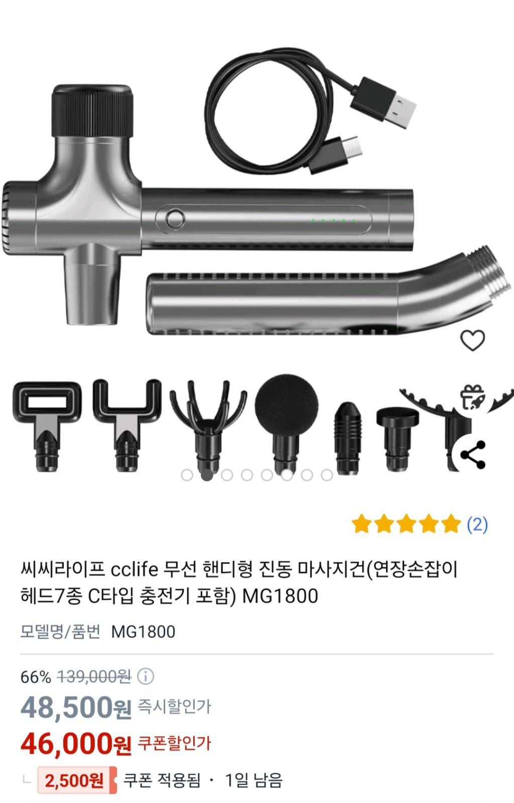 [쿠팡] 무선 핸디형 진동 마사지건(연장손잡이 헤드7종 C타입 충전기 포함) MG1800