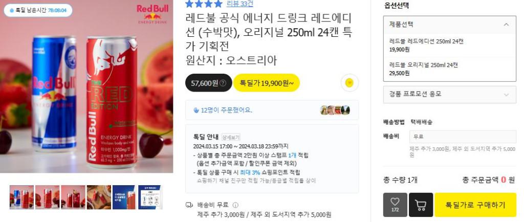 [카카오톡딜] [레드불] 레드에디션,오리지널 250ml 24캔 19,900원 / (무배)