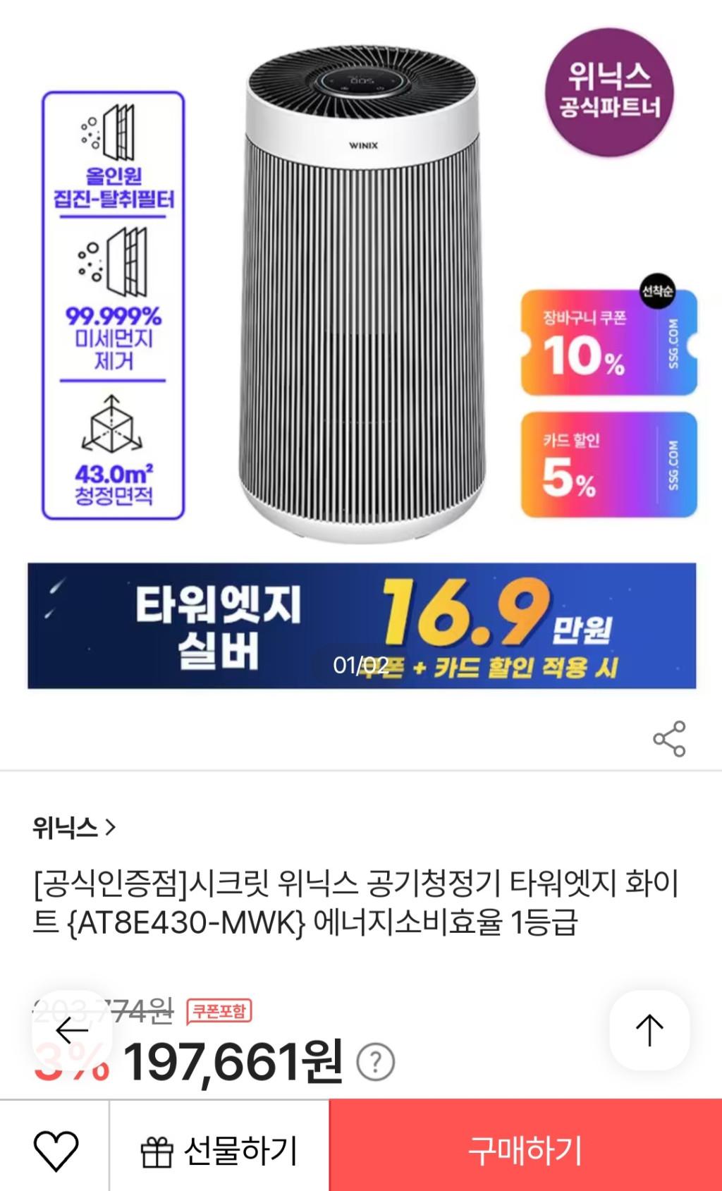 [SSG] 위닉스 공기청정기 타워엣지 AT8E430-MWK 삼성카드(무배)
