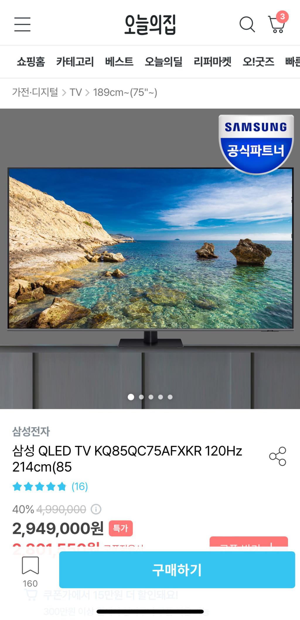 [오늘의집] 삼성 QLED TV KQ85QC75AFXKR 120Hz 214cm(85인치)