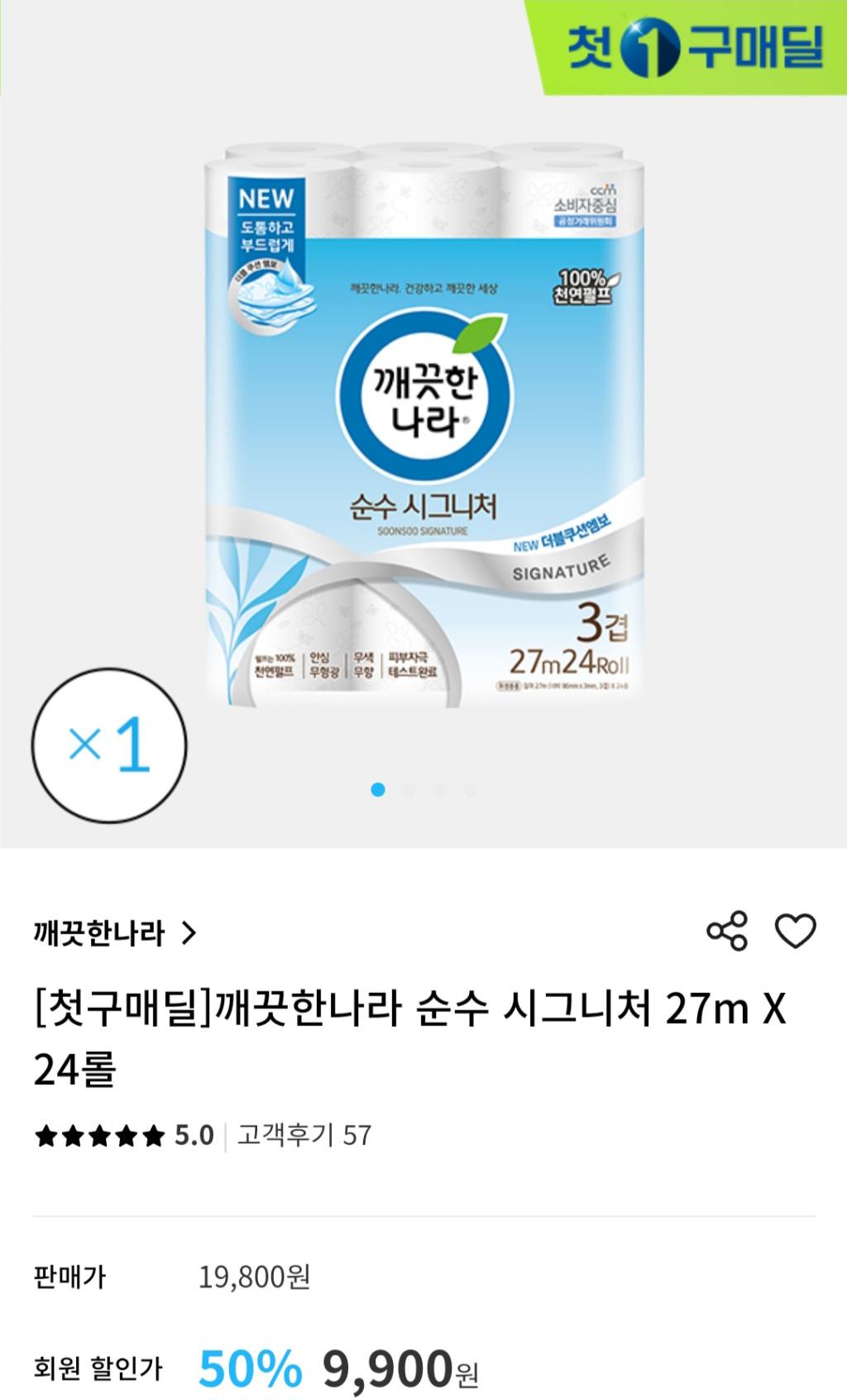 [기타] 순수 시그니처 화장지 27M x 24롤 데일리 그린패키지 키친타올 130매 x 6롤 2…