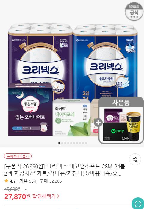 [위메프] 크리넥스 3겹 데코앤소프트 28M 24롤 2팩