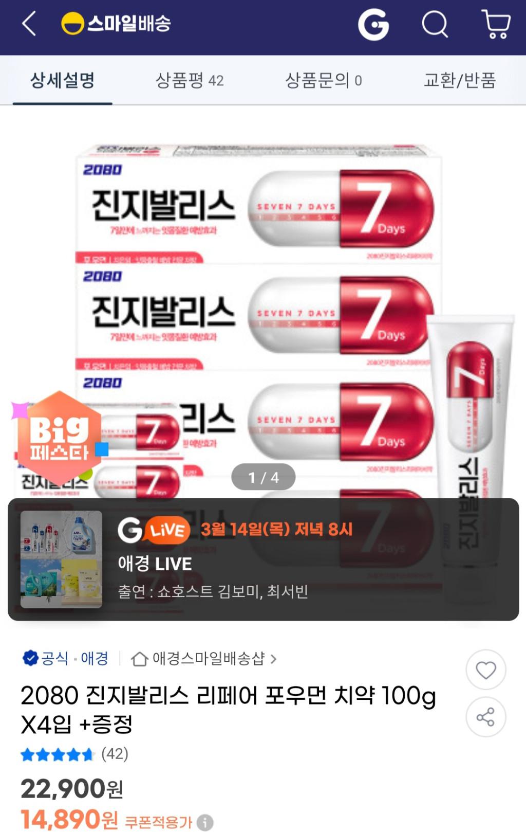 [G마켓] 2080 진지발리스 리페어 포우먼 치약 100g 4개 + 100g 4개
