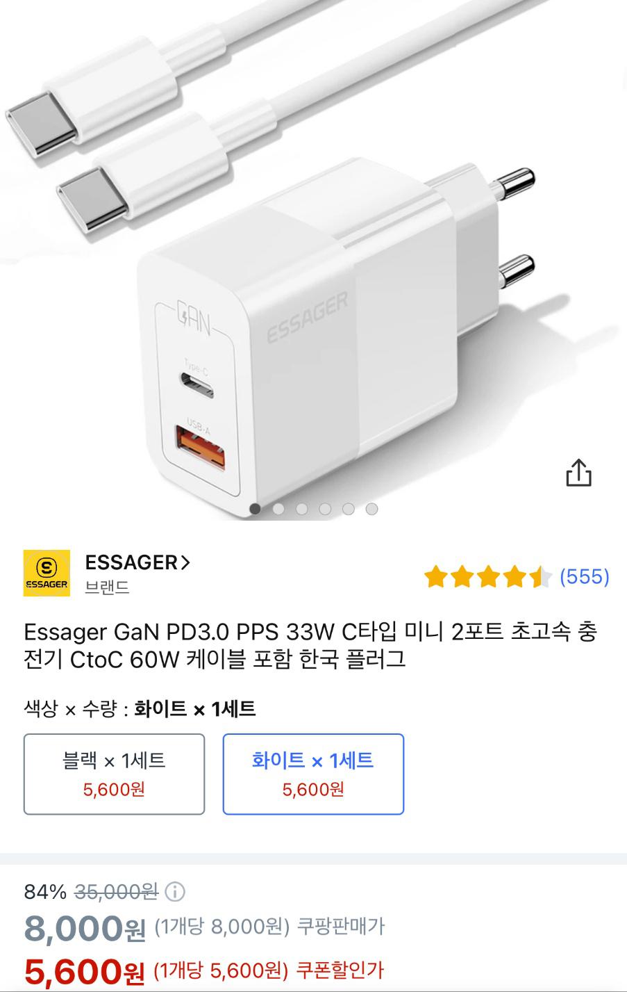 [쿠팡] Essager GaN PD3.0 PPS 33W C타입 미니 2포트 초고속 충전기 Cto…