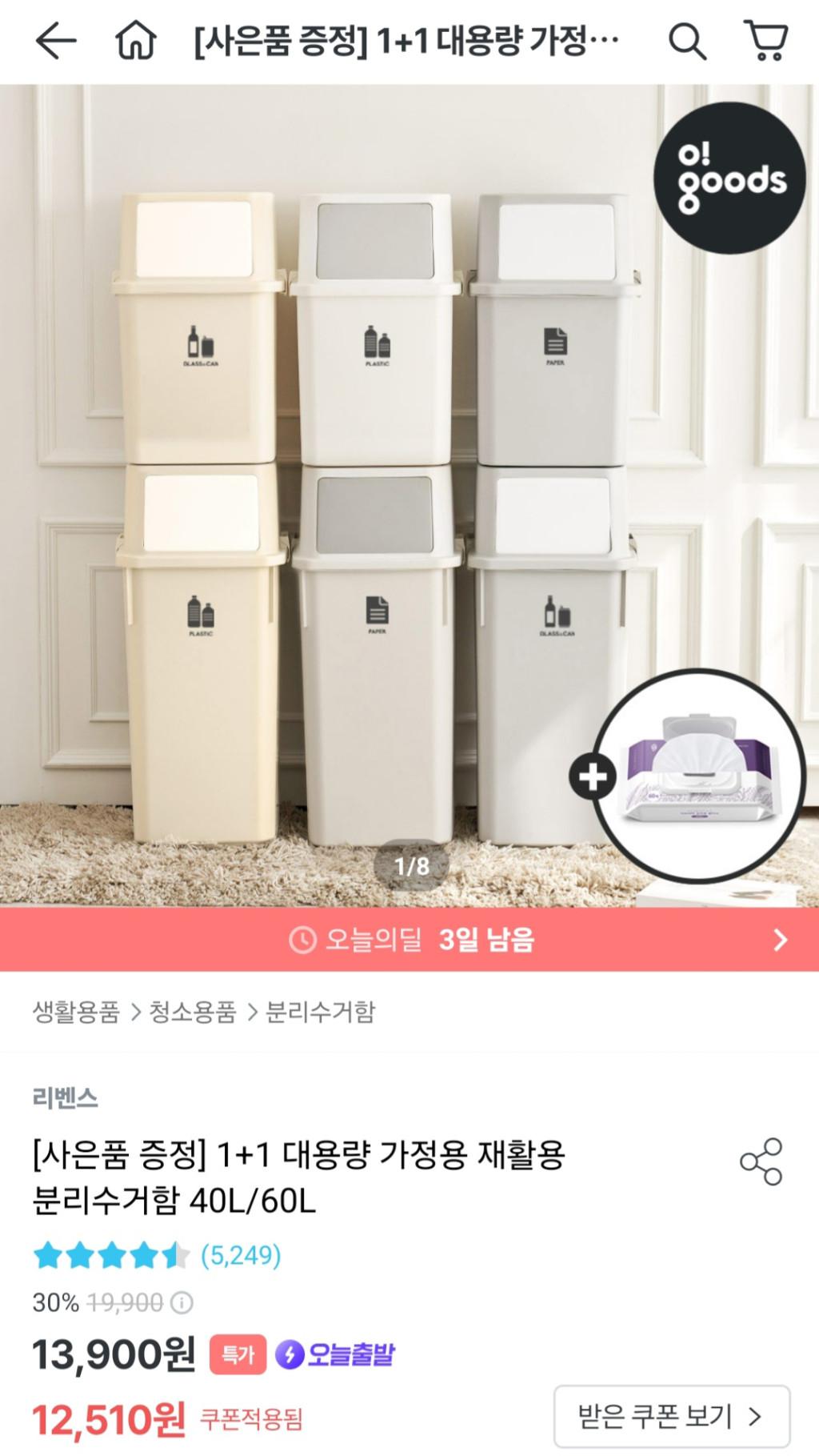 [오늘의집] 1+1 대용량 가정용 재활용 분리수거함 40L/60L