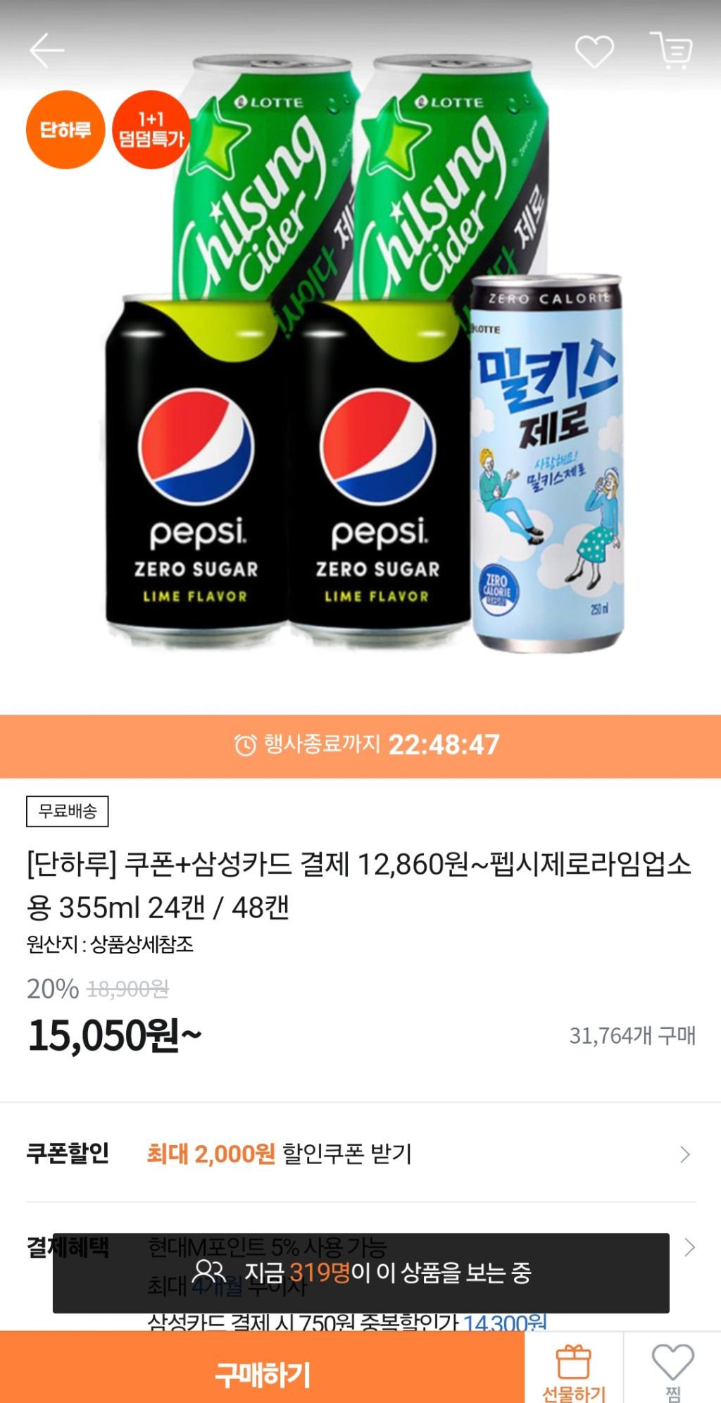 [티몬] 펩시제로라임업소용 355ml 24캔 토스페이 결제