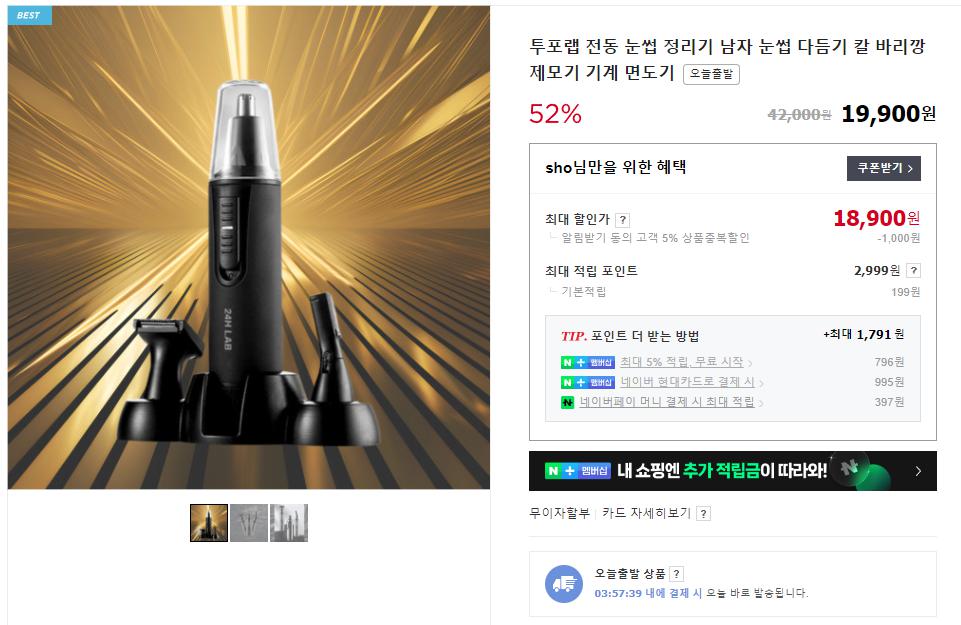 [네이버] 3 in 1 눈썹&코털정리기 19,900원 / 1+1 37,900원 무배