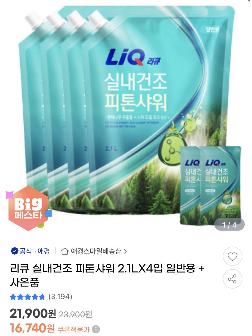 [G마켓] 리큐 실내건조 피톤샤워 세탁세제 2.1리터 X 4개 + 사은품