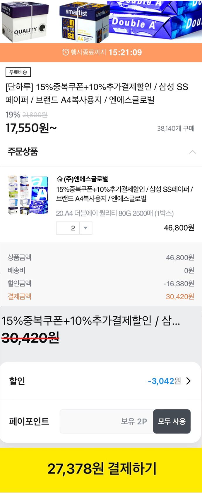 [티몬] 더블에이 A4 퀄리티 복사용지 80g 2500매 1박스 (13,689원/무배)