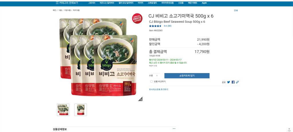 [코스트코] CJ 비비고 소고기미역국 500g x 6