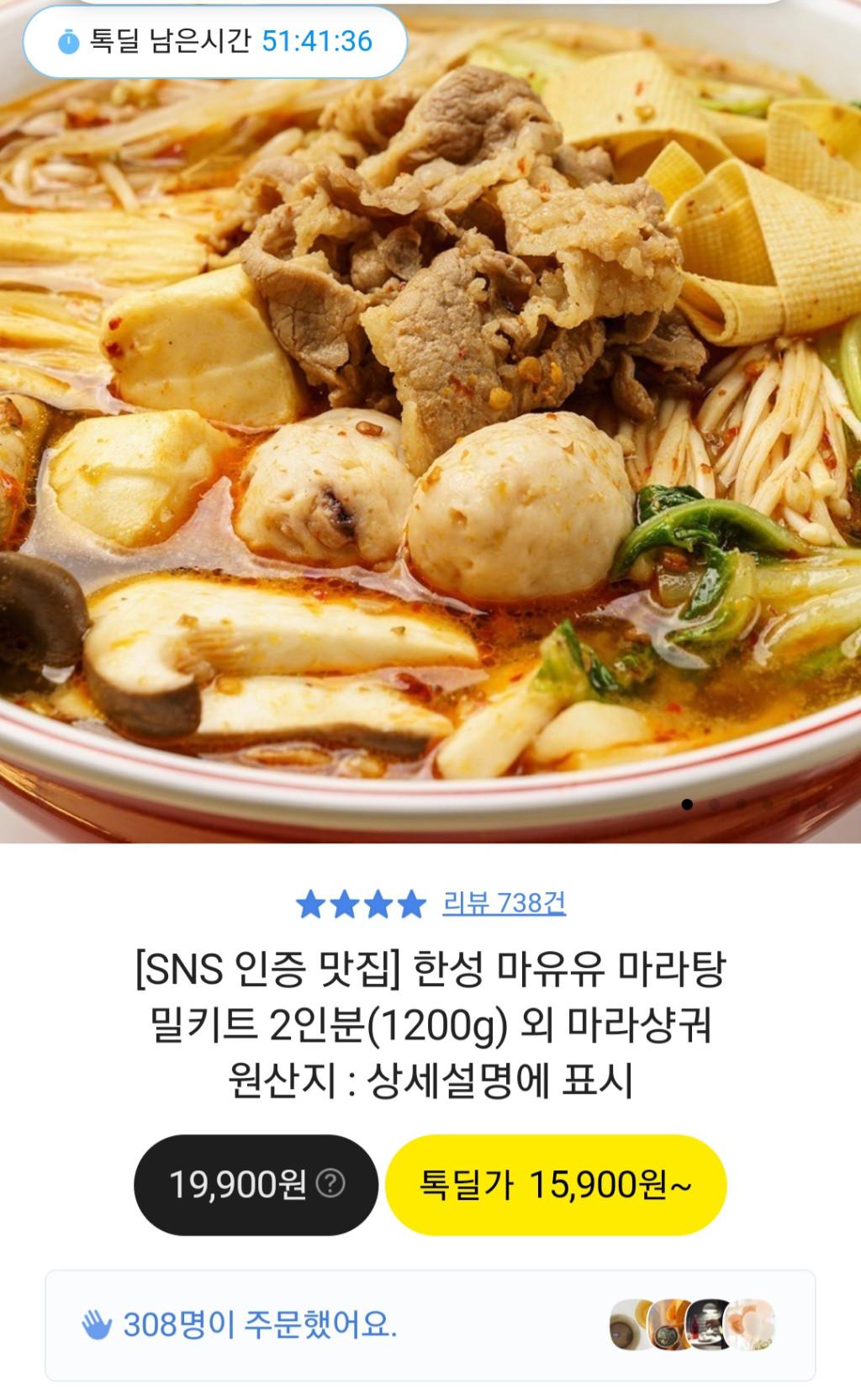 [카카오톡딜] 한성 마유유 마라탕 밀키트 2인분(1200g) (15,900원 / 무료배송)