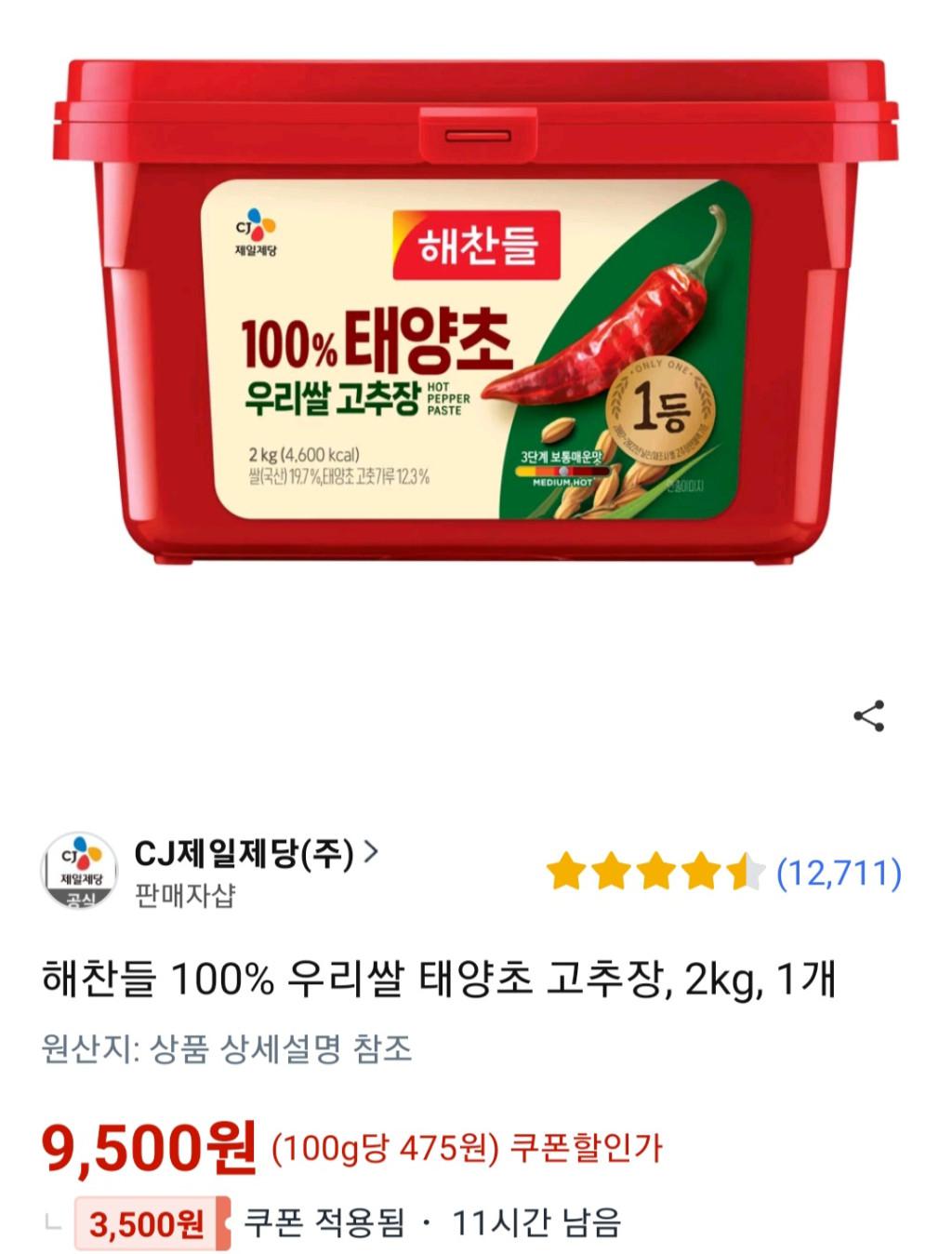 [쿠팡] 해찬들 100% 우리쌀 태양초 고추장 2kg (9,500원 / 무료배송)