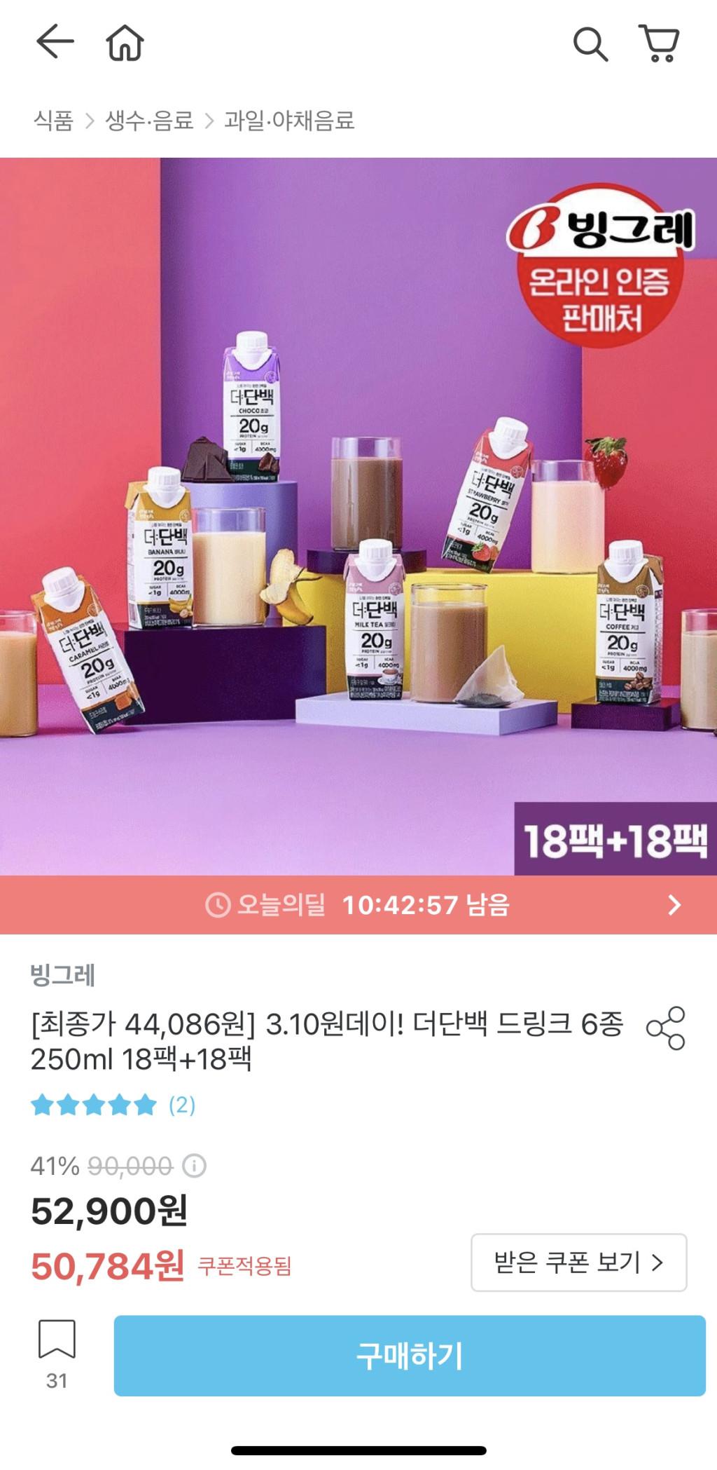 [오늘의집] 더단백 드링크 250ml 18+18팩(44086/무료)