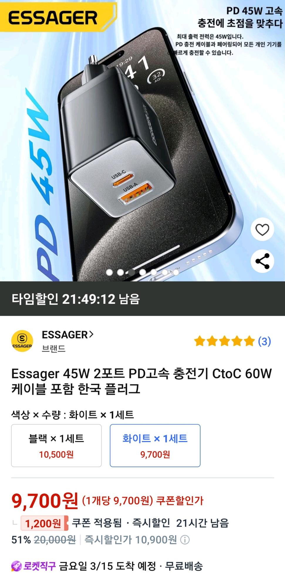 [쿠팡] 45W 2포트 충전기 + C to C 60W 케이블(무배)