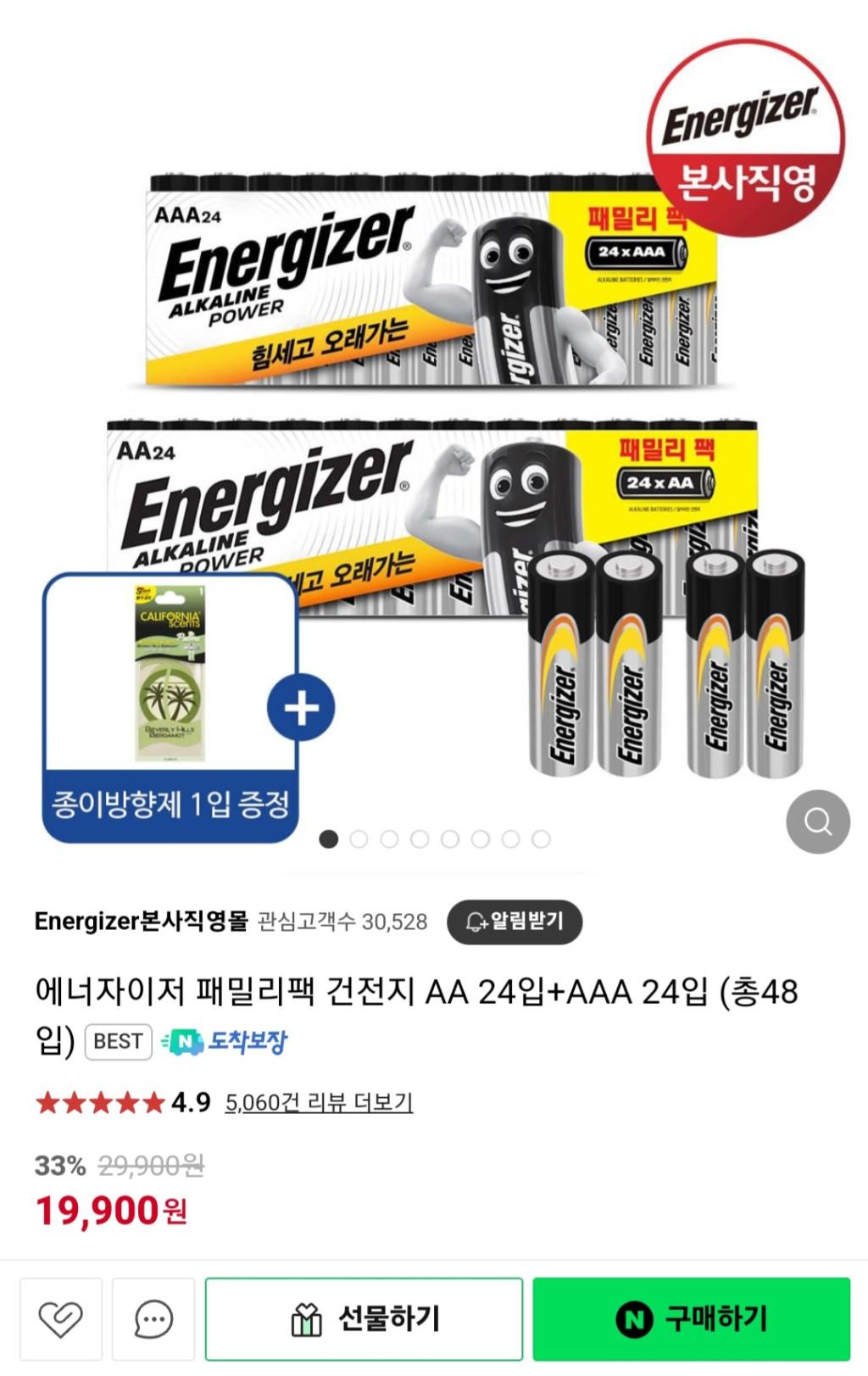 [네이버] 에너자이저 패밀리팩 건전지 AA 24입+AAA 24입 (총48입)+캘리포니아센트 종이방…