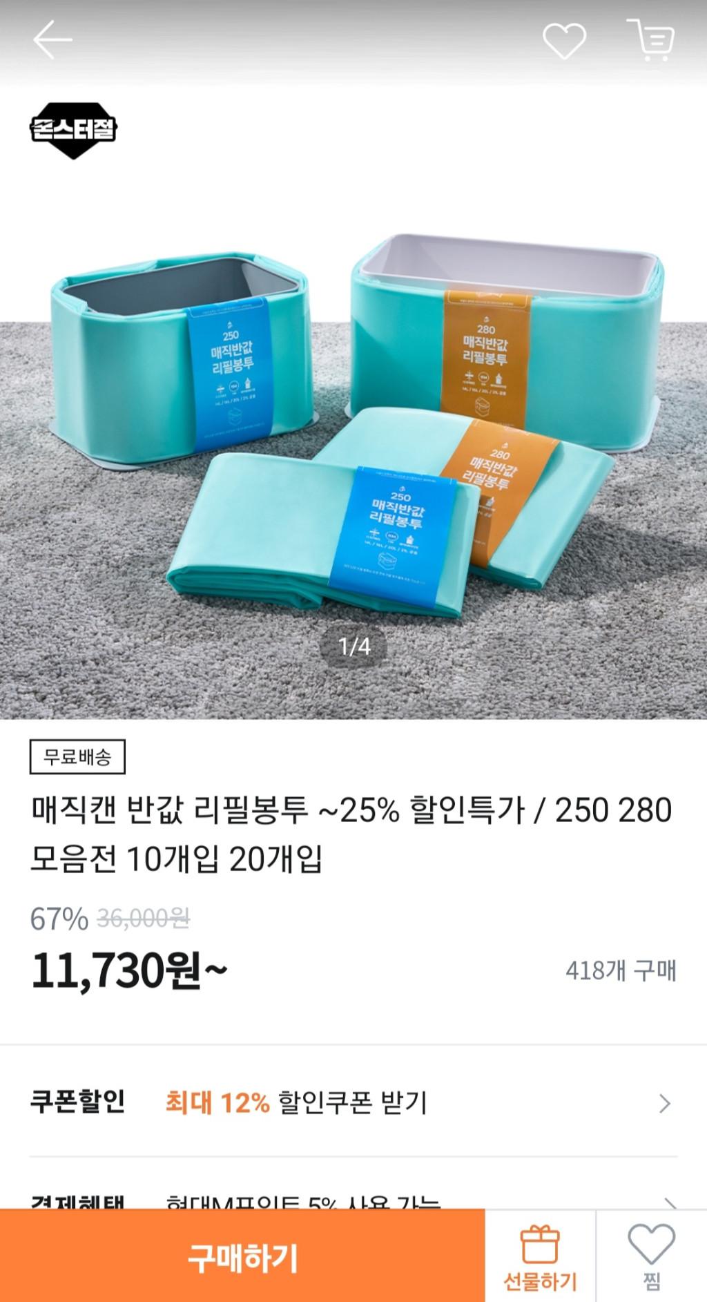 [티몬] 매직캔 호환 반값리필 봉투 250/280 20개입 카카오페이