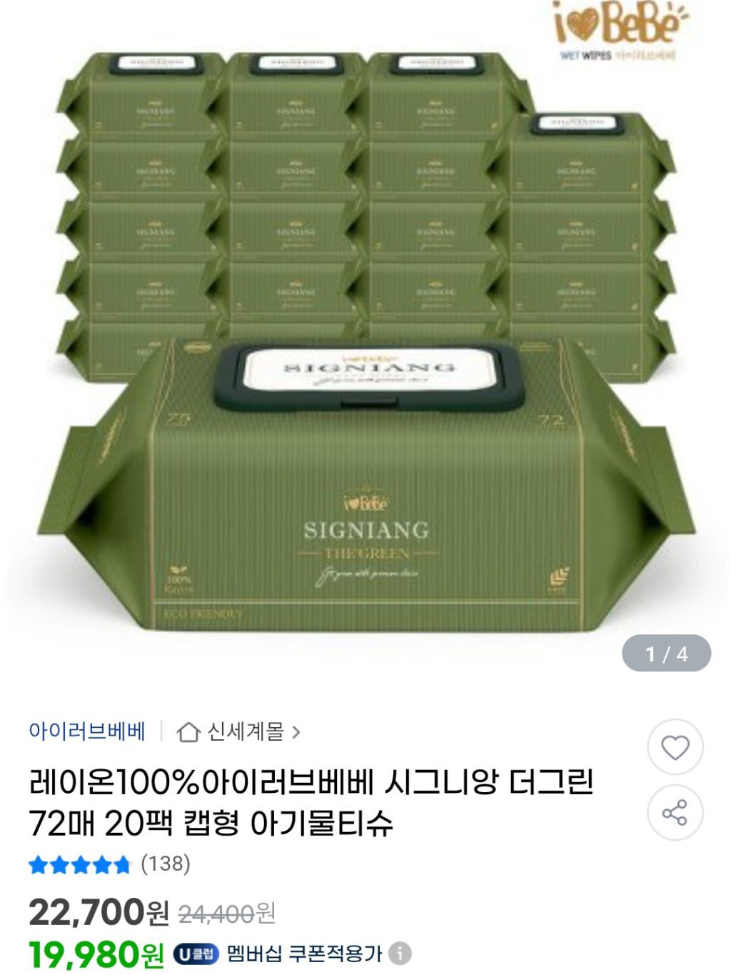 [G마켓] 아이러브베베 시그니앙 더그린물티슈 75평량 72매 20팩 유니버스클럽