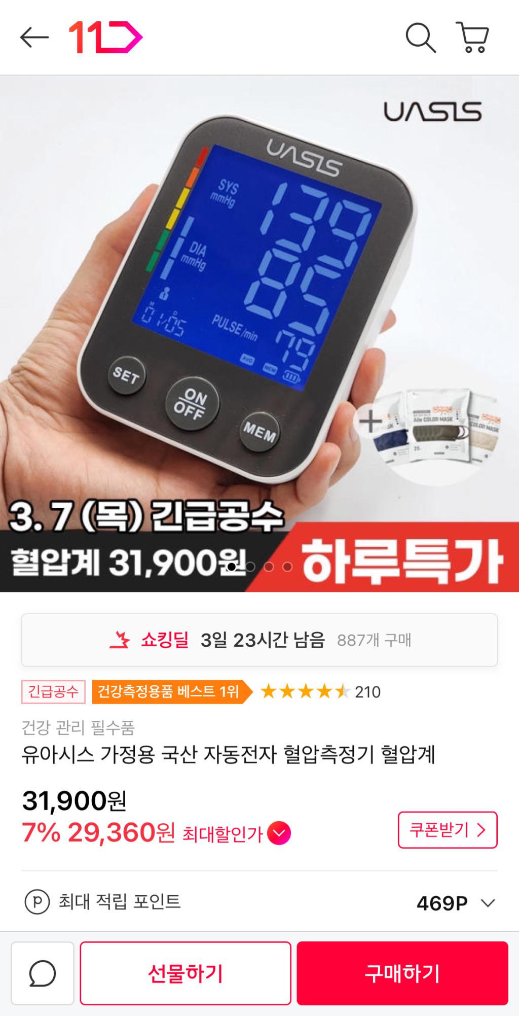 [11번가] 가정용 국산 자동전자 혈압측정기 혈압계 (29,360원/무배)