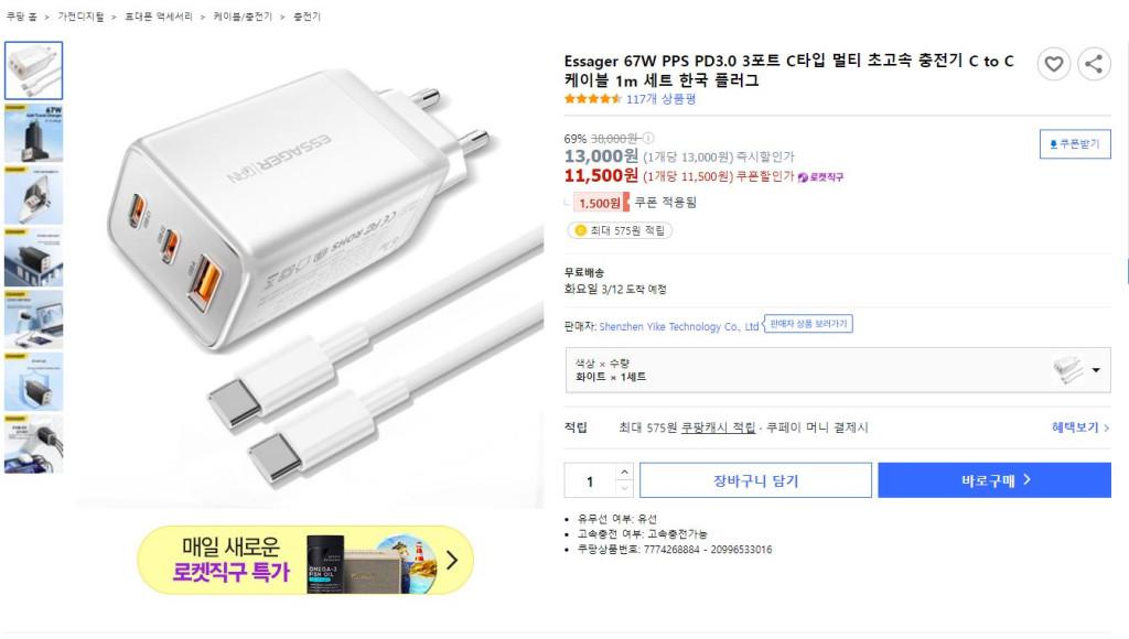 [쿠팡] [쿠팡] Essager GaN 67W PPS PD 멀티 포트 C타입 초고속 충전 어댑터…